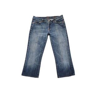 Stonewashed mid-rise denim bootcut capris. Single button and zipper front closure. Distressed detail on the seams and pocket trim. Whiskering accents. Sanded detail. Light wear near the crotch (see pictures), but otherwise in Great Condition. Five pockets.