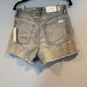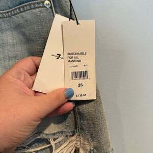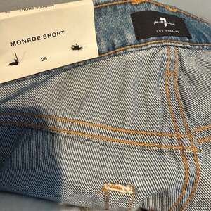 7 For All Mankind Monroe Cut Off Jean Shorts, Size 26. These distressed denim shorts feature a light wash with fading and ripped details, designed for a high-waisted fit and a raw hem. New with tags, in excellent condition. Retails for $138.