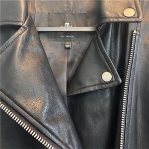 Classic 7 For All Mankind moto jacket in sleek black. Designed with high-quality faux leather, silver hardware, and quilted sleeve details for that edgy biker vibe.