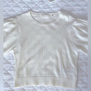 My personal notes: Color is NOT a true white. More ivory as I tried to show against the true white quilt in natural light. This was worn once. Basically brand new. Not dry cleaned bc it really didn’t need it & was hung after wearing the short time. I’m a size 10/12, fits well. It states cropped but hits me right about AT the waist. So depends on your torso. Thanks for looking & feel free to ask any other questions!