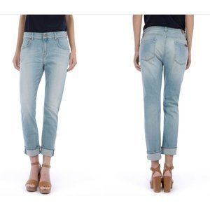 These relaxed, skinny boyfriend fit jeans for women inspire a casual, carefree attitude, dressed up or toned down. The jeans have a relaxed fit through the thigh leading to a tapered ankle-skimming cuff. Finished in washed down Nashville light blue denim with slight damage, subtle whiskers and an amazing soft-hand feel.