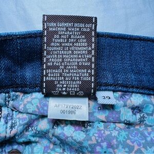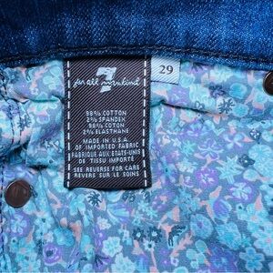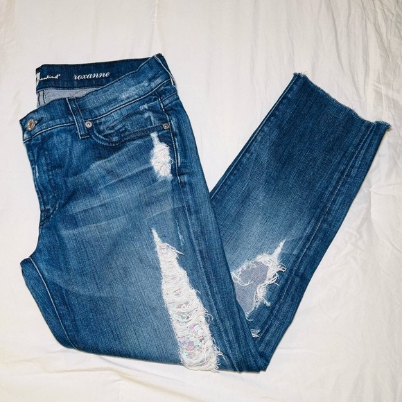 7 For All Mankind Roxanne, Distressed, Cropped, Raw Edge Hem Jeans, Womens Size 29. There is floral fabric under the rips on the left leg and the top of the right leg. The rip at the knee is torn a little larger, shown in photo.