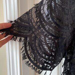 Beautiful scalloped edge lace, fringed sheer top. Wear with dress clothing or jeans. Very versatile.
