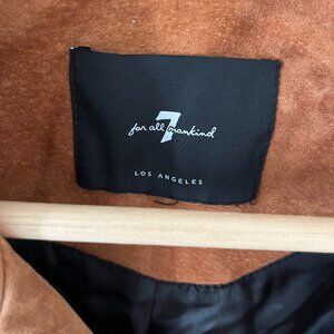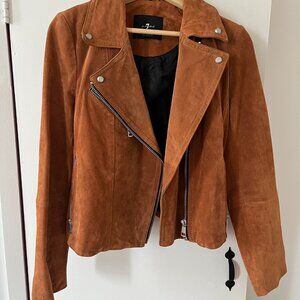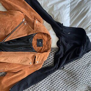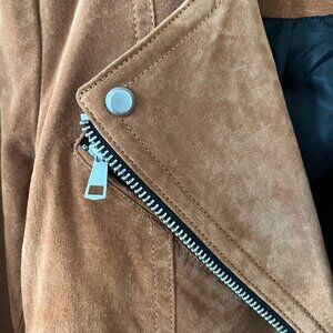 Gorgeous suede Moto jacket with a removable hoodie! So comfortable and well made. If you take care of the leather this one will last a long time!