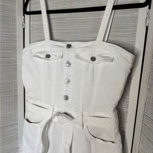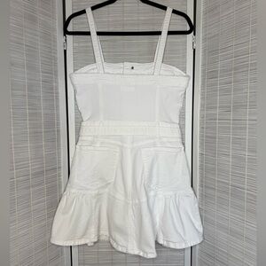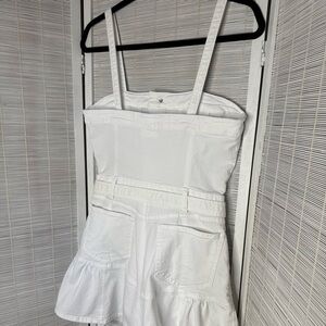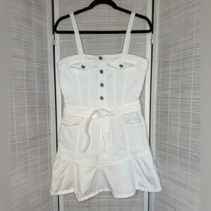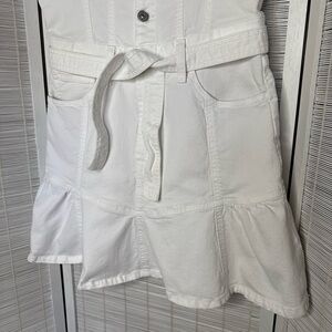 ✨ 7 For All Mankind Surplus Flounce Dress in white. Removable belt. Straps have different button holes to adjust length. Zipper fly on the skirt. Button down front. Missing the size tag, please refer to measurements. Pit to pit, 16”. Flat waist, 14”. Stretchy denim material. Good used condition.