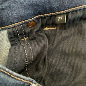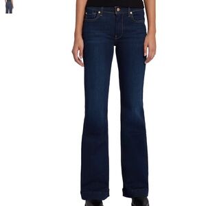 The Details: Dark wash Mid rise waist Classic five-pocket styling with iconic 7 back pocket embroidery Zip fly with button closure