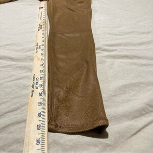 Chic tan faux leather leggings. Ideal for modern style. Small holes visible on inside of jeans where belt loops by front pockets are coming loose (highlighted).