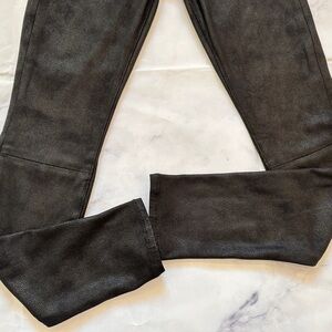 Pant is suede type feel, Soft, Skinny, Button and zip front, Pockets, Logo, Mid rise, Lightweight