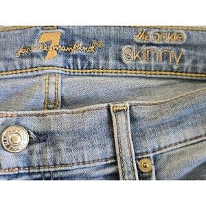 The 7 For All Mankind The Ankle Skinny Jean in Women's Size 32 features a raw hem slit and a medium wash, offering a trendy and versatile addition to your wardrobe. Made from a comfortable cotton blend denim fabric with a mid rise, these jeans are designed for a regular fit and a 27-inch inseam. The classic blue color and solid pattern are complemented by stylish accents like buttons, zippers, and the brand's logo. Perfect for various themes such as USA, Bohemian, City, and Preppy, these jeans are machine washable for easy care and maintenance.