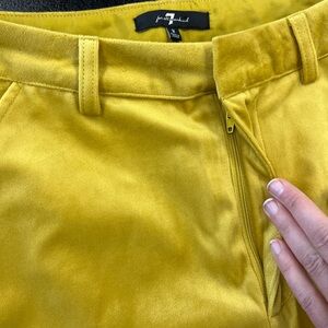 Without flaws, straight leg velvet goldenrod colored pants. Perfect office wear piece to show your vibrant personality. Side seam has a shine ribbon strip to add interest. Button and zip fly, extra buttons still attached at tag. No pockets for a smooth and sleek look at the hips and bun.