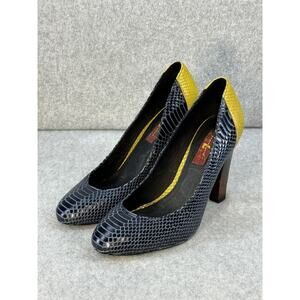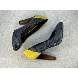 7 For All Mankind Veta Round Toe Pumps Snake Skin Yellow Black Wooden Heel 7.5M