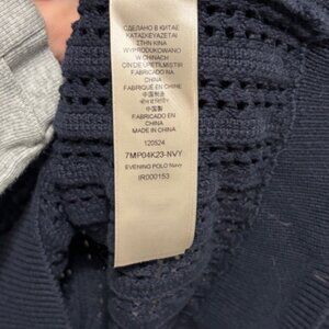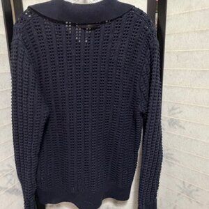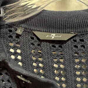 KEYWORDS: 7 For All Mankind cardigan, women’s large navy crochet sweater, cotton polo cardigan, designer layering piece, open weave knit, preppy casual top, boho-chic sweater, lightweight knitwear, evening casual cardigan