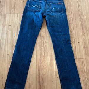 7 For All Mankind- Women's Straight Leg Stretchy Blue Jeans (Size 50). Some fraying on legs. See photos for more details. Size of waist is 30. If you have any further questions, feel free to reach out to me.