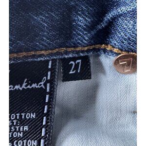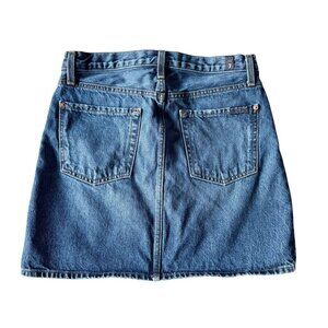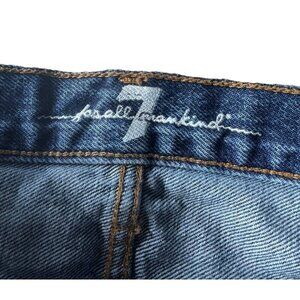 7 For All Mankind woman's blue denim mini skirt. Skirt is factory distressed on the front. It's made of 100% hard denim (no stretch) and is a woman's size 27. Very Y2K!