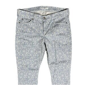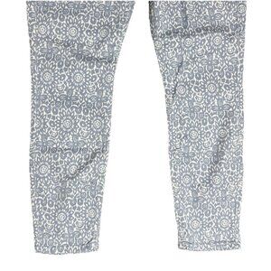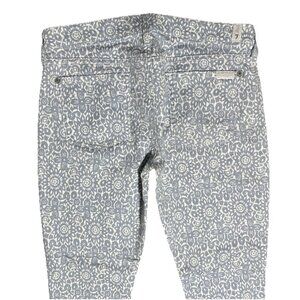 Pair of 7 For All Mankind Women’s Size 30 Ankle Skinny Jeans in a Powder Blue Floral medallion pattern. These jeans feature a zip closure and a low rise. They are made from a cotton and spandex blend with a stretch feature, making them comfortable to wear. The design includes a 5-pocket design and the brand's logo accents. Perfect for the summer, fall, and spring seasons, these jeans have a slim fit and are machine washable. The 7 For All Mankind is known for its beach, rock, bohemian, and chic themes, making these jeans a stylish and versatile addition to any wardrobe.