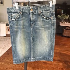7 For All Mankind denim pencil skirt with slit Size 28. Only worn a couple times. There is a small flaw next to the top of the slit in front. See close up photo. Darling and flattering.