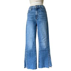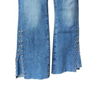 Silver and copper colored studded details line the kick flare of these jeans. Rockstar gf vibes! Raw hem finish. Made of cotton, lyocell, elasterell and elastane. These have great stretch to hug your body just right! In overall excellent condition. Labeled size 28.