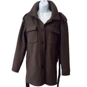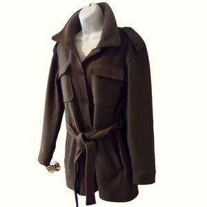 Soft fuzzy unlined spring/fall button up belted coat jacket 2 chest pockets 2 side hand pockets, button cuffs, button shoulder straps or epaulettes size S measures flat 19" pit to pit 31" long in excellent like new condition cognac brown