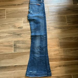 Some sign of wear on the bottoms but it is not all the way ripped through. Inseam 34, fabric has stretch.