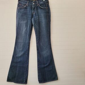 A Pocket jeans by 7FAM, red stitching design, dark wash bootcut, lightly distressed. Some wear at pockets, back hems. 100% cotton, made in the USA.
