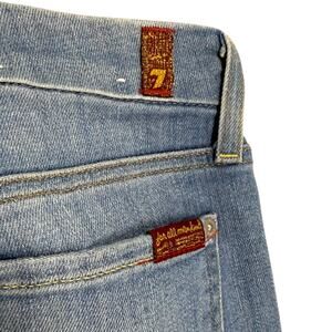 Seriously slimming skinnies from the 7 For All Mankind denim goddesses. The Skinny features a low rise and skinny fit from the hip to the hem that wears like a second skin. Mid-rise silhouette. Beige-threaded topstitching. Polished silver-tone hardware. Brand labels at the back waist and pocket. Five-pocket design. Belt loop waistband. Zipper fly and button closure. Edgy step-hem detail.