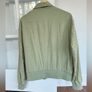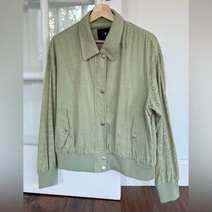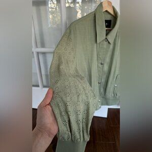 7 For all mankind, pastel green jacket size M beautiful embroidered sleeves cottage style perfect for spring and summer in exceptional condition, collar neck