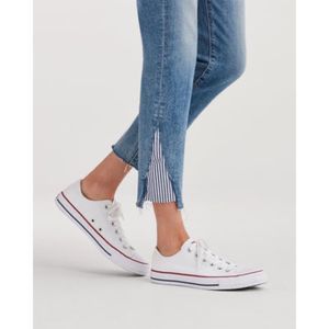 Ankle skinny crafted from 11. 8 oz stretch denim in a vintage blue shade. Designed with a raw edge step hem with striped kick.