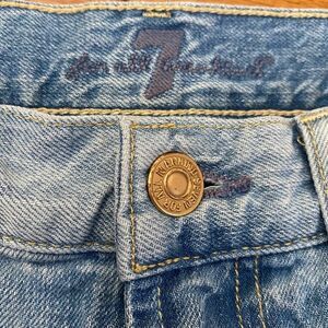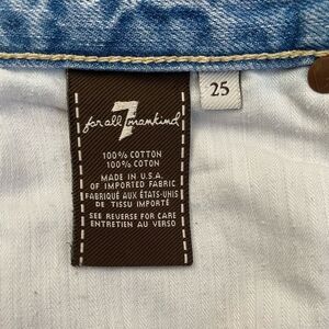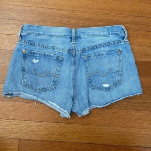 7 For All Mankind jean shorts size 25. Raw cut frayed hem and light fading detail. Zipper close and mental button closers. 2 front pockets, 2 back pockets, and coin pocket in front right pocket. Some stitching detail on back pockets. Worn once or twice excellent condition!