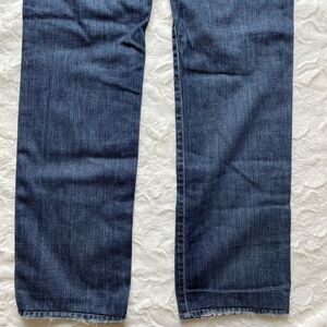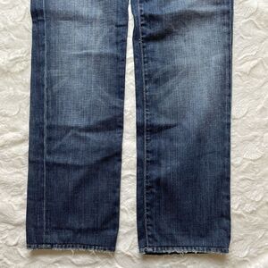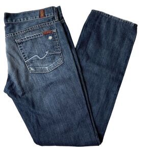 Dark Wash Distressed Low Rise 7 For All Mankind Straight Leg Denim Jeans.