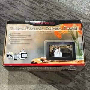 7 inch digital photo frame with TFT screen. Sleek black and silver design. Ideal for displaying photos instantly.