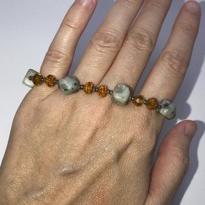 This bracelet is 7" long. This bracelet features faceted roundel topaz Swarovski, sesame jasper pebbles and clear seed beads it has a brass toggle closure. This bracelet is strung on 19 strand steel wire with a nylon coating. This is a handmade bracelet.