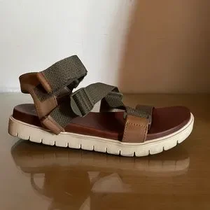 Athletic sandal with sturdy green straps and brown leather backing. Used normally, no imperfections!