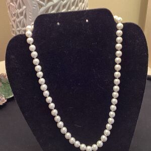 Faux white pearls about 7 mm in size consistent throughout this 18” necklace. Gold tone pearl clasp. Cording is knotted between each pearl. Classic style