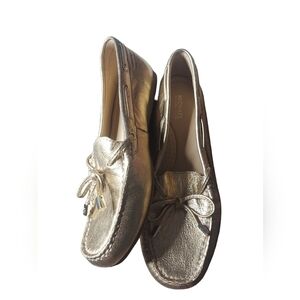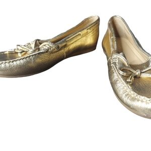 7 Michael Kors gold loafers They are in great condition. Our shoes are preloved and so they may have little ware. Please check out the pictures. no rips stains tares or holes. In a smoke free and pet free home. very comfortable shoes. Same day or next day shipping.**don't hasitate to make an offer***bl33