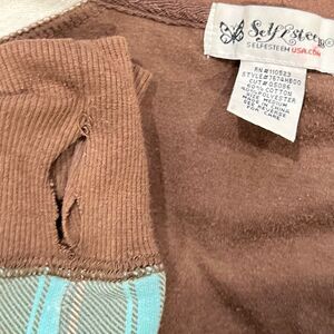 • Self Esteem: turquoise and brown plaid hooded zip up, juniors medium - has thumb holes and I can’t remember if it came like that or I did it myself (this is officially vintage in 2025 since it’s from my high school days)