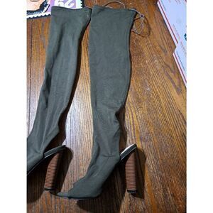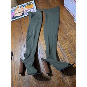 Good Used Condition Women's Size 7 Public Desire Olive Army Green Open Toe and Heel Stacked High Heel Long Stretch Over Knee Fabric Boots with Draw String Tops