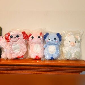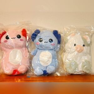 Adorable plush pet toy set featuring vibrant pink, blue, and white colors. Perfect for a children's birthday party or even as toys for small pets to cuddle and play with. No hard pieces.