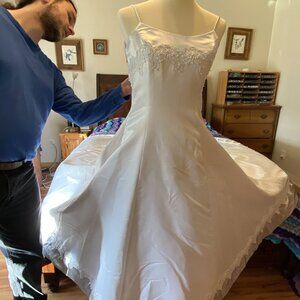 This is such a gorgeous dress! It has silver satin edging, silver satin roses, and beautiful beadwork throughout the dress. It is a super neat dress and will look stunning walking down the aisle! This dress is made to last to the next generation, elegantly adorned for the perfect wedding day. This is an heirloom quality wedding gown. Please be prepared to pay in cash when you come to try on the dresses.