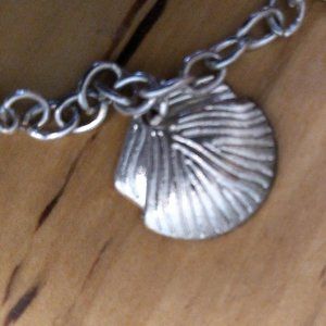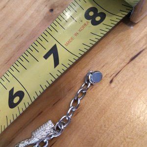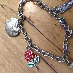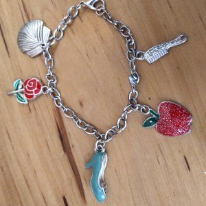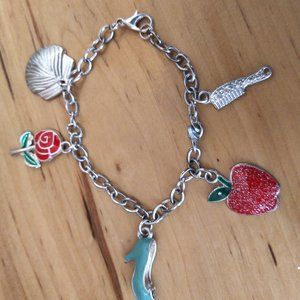 7" big girl Childs Sleeping Beauty bracelet - charms on this silvertone bracelet include red apple, comb, mirror (or shell?) - a high heel blue pump and a red rose. Lobster clasp. Excellent condition little girls costume piece. - for dress up or daily wear.