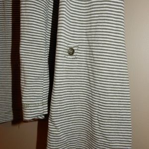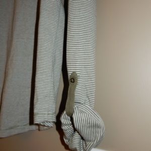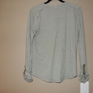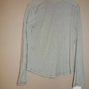Olive Green striped 7 button henley. Sleeves roll and have button to hold them. 92% Cotton 8% spandex. Approx measurements when laying flat: 20in across underarm to underarm, 25in long, Sleeves 28in long.