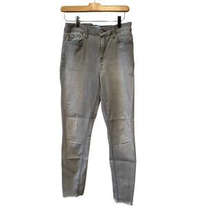 7 for All Mankind B (Aire) Skinny High Waisted Stretch Jeans Gray, size 27. Good preowned condition, cotton poly lyocell spandex blend. Raw hems and lots of stretch