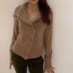 Super cozy and warm 99% cotton 1% polyester sweater. It has a lovely asymmetrical zipper and a fuzzy collar. Size is medium but model is a size small so clearly this sweater is versatile in the fit department.