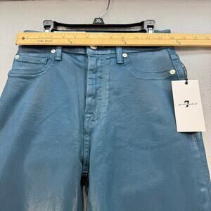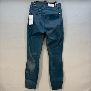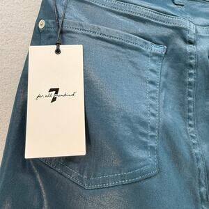 7 For All Mankind Women's Pants. Teal blue in color. Tagged size 26 (2). These women's 7 for all Mankind jeans feature a unique coated fabric with a wet like shine, classic five pocket design, a skinny leg and a high rise fit. Style number 7U040352. In new with tag condition - NWT.