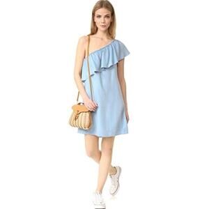 A one-shoulder dressed with a ruffled overlay at the neckline. Unlined. Fabric: Soft denim. 100% lyocell