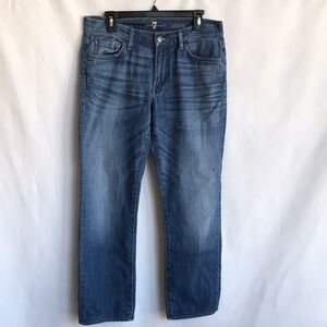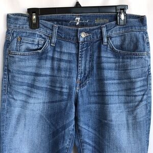 7 for All Mankind Slimmy blue jeans. Size 32. Good preowned condition except for a few spots on front, as seen on photos.