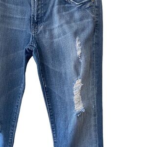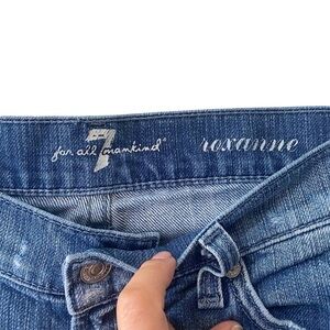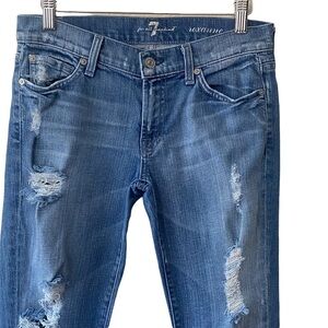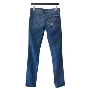 7 for All Mankind Y2K Roxanne Distressed Skinny Jeans. Light blue wash, low rise, and distressed accents throughout. Five-pocket design with zip-fly and single button closure. 98% cotton and 2% spandex. Light wear between thighs and on distressing as seen in pictures. Otherwise, in excellent pre-owned condition.