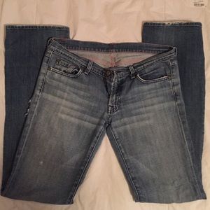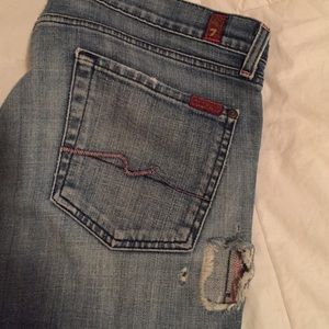 Light blue, boot cut jeans. Size 31. Very worn but in a good way! Tear in the back right thigh below butt pocket-- kind of sexy!