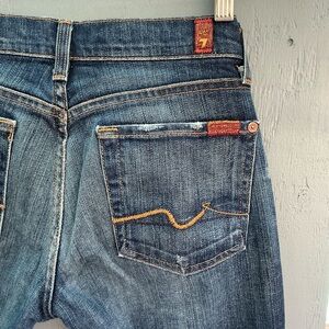 7 for all Mankind Jeans Womens Size27 Yellow Pocket Dark Blue Distressed Bootcut