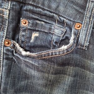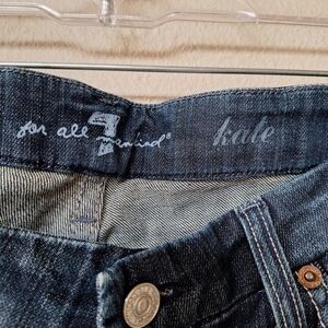 7 for all Mankind Kate jeans. 5 pocket styling. Light distressing. Zip and button closure. Medium wash. Light stretch. Straight Leg. Size and fabric tag missing so double check measurements. I'm guess a 30 or 32. Waist flat lay 16.5 Rise 8" Inseam 33" measurements are approximate