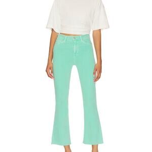 A high-rise vintage-inspired slim fit with flat ankle length with a flare in a cool mint green, with just enough stretch for a great fit